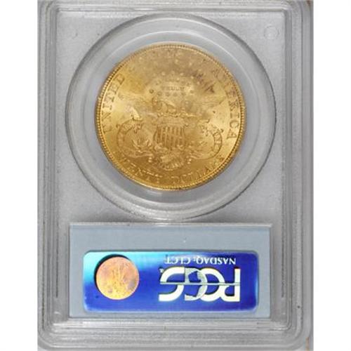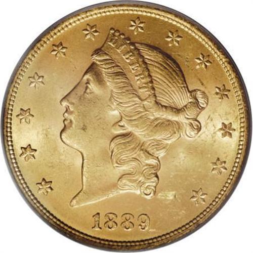 <B>1889 $20 MS62 PCGS.</B></I> The 1889 is a scarce issue (Jeff Garrett and Ron Guth, 2006), infrequently found any finer than the present MS62 coin. Gold-tan surfaces reveal some luster breaks and small contact marks and luster grazes. Sharp definition is apparent on the design features. Population: 93 in 62, 13 finer (9/07).<BR><BR><B>Coin Engraver:</B> James B. Longacre<BR><BR><b>Shipping:</b> Coins & Currency (<a target="_blank" href="http://www.heritageauctions.com/common/shipping.php">view shipping information</a>)