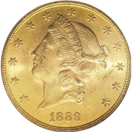 <B>1889 $20 MS63 PCGS.</B></I> The grading services have never graded an 1889 twenty any finer than this piece. For the connoisseur, this is tied with few others as the finest available example. The surfaces have a few scattered marks that are consistent with the grade. Rich yellow-gold luster and brilliant mint frost is enhanced by subtle rose toning and a few splashes of darker color. The opportunity to actually acquire an MS63 representative seldom appears. It has been nearly two years since the last PCGS MS63 piece offered at auction. In fact, this is only the fourth similar example we have offered in the past eight years. Population: 13 in 63, 0 finer (8/07).<BR><BR><B>Coin Engraver:</B> James B. Longacre<BR><BR><b>Shipping:</b> Coins & Currency (<a target="_blank" href="http://www.heritageauctions.com/common/shipping.php">view shipping information</a>)