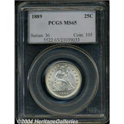 <B>1889<25C> MS65 PCGS.</B></I> A boldly struck Gem with flashy luster, frosty surfaces, and a seemingly pristine obverse. Mint figures indicate that 12,000 pieces were struck for circulation, and only a few of these coins were retained upon issue by knowledgeable numismatists. An important opportunity.<BR><I>From the JFS Collection.</B></I> <BR><BR><B>Important notice:</B> Heritage usually auctions material at the rate of 200-250 lots per hour. On some occasions eBay Live bid software or the Internet may not be able to keep up with the pace of the auction. We recommend placing a realistic absentee bid now as insurance to avoid disappointment. Occasionally the auctioneer may eliminate or reject an eBay Live bid, and the auctioneer may also reopen a lot after the close of the eBay live bidding (usually because we missed an audience bid), and may reject your bid even if it shows you as the winning bidder. By bidding via eBay Live, you agree that Heritage may award the lot to another bidder at its sole discretion under the circumstances described above or any other reasonable circumstances. Since eBay bids are not shown to us until we open the lot on the floor, we treat those bids just like floor bids. In most cases the floor responds before the eBay bid is presented to us, due to Internet lag time, so for consistency we have made it a policy that floor bids are always considered first over tie eBay live bids. Also please note that all Heritage lots purchased through eBay Live carry a 20% Buyer's Premium. Please make sure you read the Terms and Conditions before you bid. </span></font></tr></table></td></tr></table>