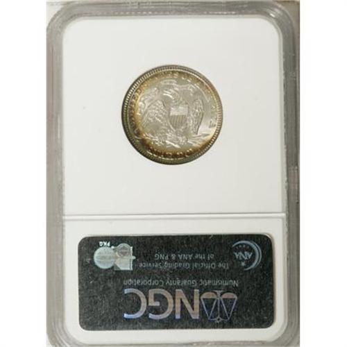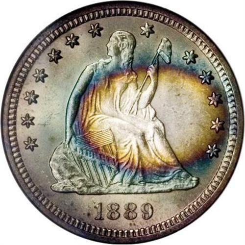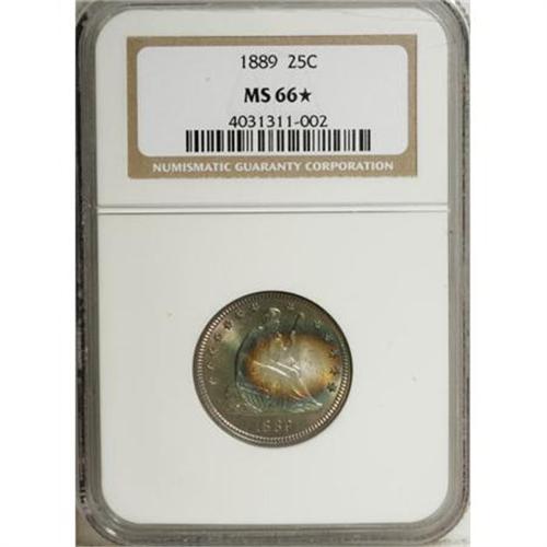 <B>1889 25C MS66 <img border='0' src='http://www.heritagecoins.com/images/star.gif' width=10 height=10> NGC.</B></I> Both sides display iridescent bands of ocean-blue and golden-tan. The lovely toning undoubtedly inspired the Star designation from NGC. This highly lustrous Premium Gem has clean fields and an exacting strike. 1889 was the final ultra-low mintage Philadelphia issue. A scant 12,000 pieces were struck; the facility's production rose to 80,000 pieces in 1890.<BR><BR><B>Coin Engraver:</B> Christian Gobrecht<BR><BR><b>Shipping:</b> Coins & Currency (<a target="_blank" href="http://www.heritageauctions.com/common/shipping.php">view shipping information</a>)