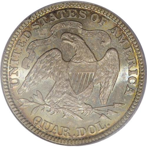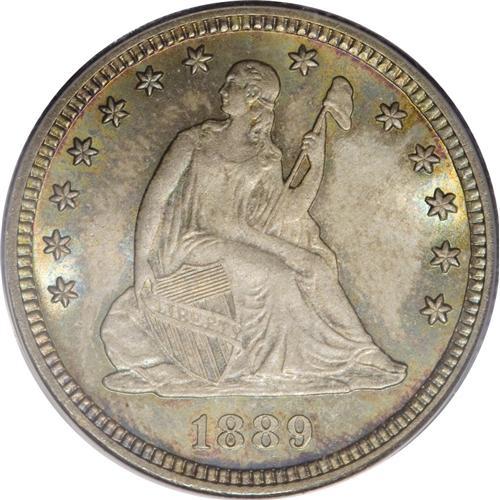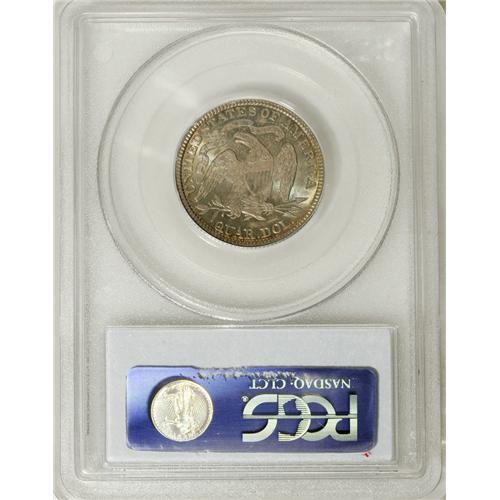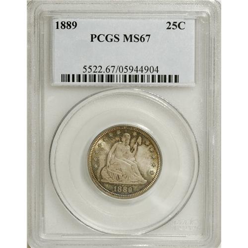 <B>1889 25C MS67 PCGS.</B></I> The 1889 quarter is the last issue in the string of 1879-1889 issues that number only in the low five digits in terms of total mintage. Collectors of the day apparently were aware of the small mintages and kept numerous pieces, fortunately for numismatists today. This example offers beautiful copper and jade-green toning on both sides, complementing gorgeous luster and the bold strike. Population: 23 in 67, 1 finer (3/07).<BR><BR><b>Shipping:</b> Coins & Currency (<a target="_blank" href="http://www.heritageauctions.com/common/shipping.php">view shipping information</a>)