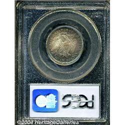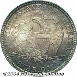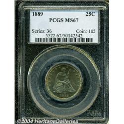 <B>1889<25C> MS67 PCGS.</B></I> One of only 12,000 business strike Quarters produced in 1889, this Superb Gem was obviously well cared for since the time of issue. While some survivors of this date display semi-prooflike or prooflike finishes, this coin is uniformly frosted with captivating cartwheel effects. Colorful sea-green toning overlays the obverse, the reverse is somewhat lighter with a silver-gray center deepening to crimson, then turquoise-blue at the border. Certainly one of the finest known examples. Population: 21 in 67, 1 finer (9/04). <BR><BR><B>Important notice:</B> Heritage usually auctions material at the rate of 200-250 lots per hour. On some occasions eBay Live bid software or the Internet may not be able to keep up with the pace of the auction. We recommend placing a realistic absentee bid now as insurance to avoid disappointment. Occasionally the auctioneer may eliminate or reject an eBay Live bid, and the auctioneer may also reopen a lot after the close of the eBay live bidding (usually because we missed an audience bid), and may reject your bid even if it shows you as the winning bidder. By bidding via eBay Live, you agree that Heritage may award the lot to another bidder at its sole discretion under the circumstances described above or any other reasonable circumstances. Since eBay bids are not shown to us until we open the lot on the floor, we treat those bids just like floor bids. In most cases the floor responds before the eBay bid is presented to us, due to Internet lag time, so for consistency we have made it a policy that floor bids are always considered first over tie eBay live bids. Also please note that all Heritage lots purchased through eBay Live carry a 20% Buyer's Premium. Please make sure you read the Terms and Conditions before you bid.