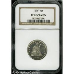 1889 25C PR62 Cameo NGC. The ice-white devices exh <B>1889 25C PR62 Cameo NGC.</B></I> The ice-white devices exhibit obvious Cameo contrast with the slightly hazy fields. A well struck and lightly toned representative of this low mintage date. Just 711 pieces were struck. <BR><BR><B>Important notice:</B> Heritage usually auctions material at the rate of 200-250 lots per hour. On some occasions eBay Live bid software or the Internet may not be able to keep up with the pace of the auction. We recommend placing a realistic absentee bid now as insurance to avoid disappointment. Occasionally the auctioneer may eliminate or reject an eBay Live bid, and the auctioneer may also reopen a lot after the close of the eBay live bidding (usually because we missed an audience bid), and may reject your bid even if it shows you as the winning bidder. By bidding via eBay Live, you agree that Heritage may award the lot to another bidder at its sole discretion under the circumstances described above or any other reasonable circumstances. Since eBay bids are not shown to us until we open the lot on the floor, we treat those bids just like floor bids. In most cases the floor responds before the eBay bid is presented to us, due to Internet lag time, so for consistency we have made it a policy that floor bids are always considered first over tie eBay live bids. Also please note that all Heritage lots purchased through eBay Live carry a 20% Buyer's Premium. Please make sure you read the Terms and Conditions before you bid. This lot is being auctioned in conjunction with a live floor auction by Heritage Galleries & Auctioneers. All final auction and invoice information will be supplied by Heritage Galleries & Auctioneers, and all other information should be considered preliminary. Lot:5902