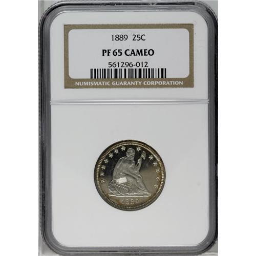 <B>1889<25C> PR65 Cameo NGC.</B></I> A lovely Gem cameo proof with excellent contrast; a borderline Ultra Cameo specimen, in our opinion. The obverse is mostly brilliant while the reverse has lovely rainbow iridescence along the borders.