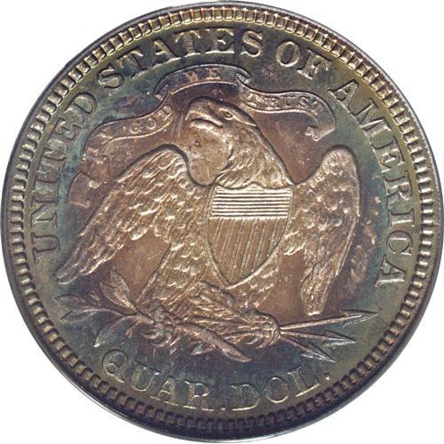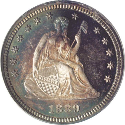 <B>1889<25C> PR66 Cameo PCGS.</B></I> The lovely original toning on each side is apricot-gold in the centers, ceding to electric blue at the borders, with the reverse adding a dollop of jade-green. Radiant luster emanates beneath, and the cameo contrast is quite high. Increasing this issue's popularity is its paucity of business strikes (12,000 minted), one of a string of low mintage business-strike issues from 1879 to 1890 that exert added pressure on the proofs. Population: 4 in 66, 2 finer (4/06).
