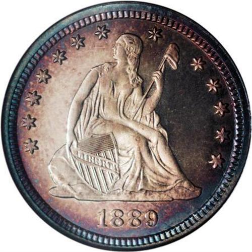 <B>1889 25C PR67 Cameo NGC.</B></I> Easily one of the finest survivors from a proof issue of just 711 pieces, this late-date Seated quarter retains distinct contrast despite layers of rich powder-blue, champagne, rose, and sage toning. The moderately reflective surfaces are exquisitely preserved beneath the patina. Census: 3 in 67 Cameo, 2 finer (9/07).<BR><BR><b>Shipping:</b> Coins & Currency (<a target="_blank" href="http://www.heritageauctions.com/common/shipping.php">view shipping information</a>)