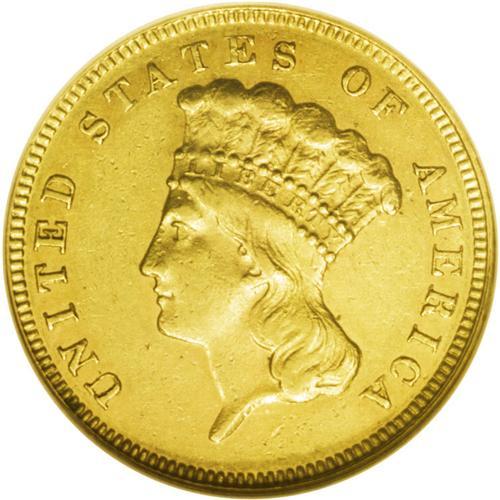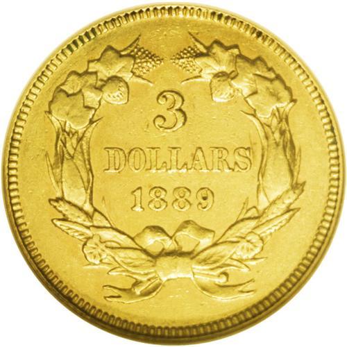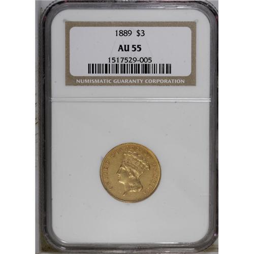 <B>1889<$3> AU55 NGC.</B></I> Although the mintage fell in this year to only 2,300 coins, most of the issue was saved. This example shows considerable mint luster clinging to the protected areas around the periphery. Under a loupe, several tiny dotlike indentations show on the obverse along with light field chatter. A well struck piece.