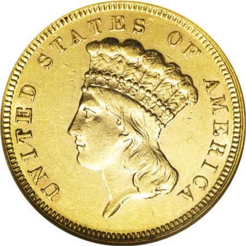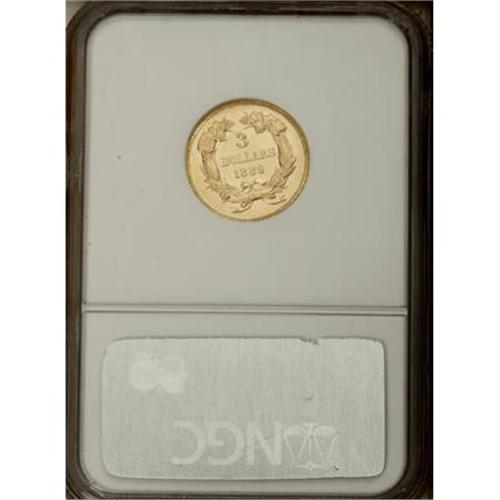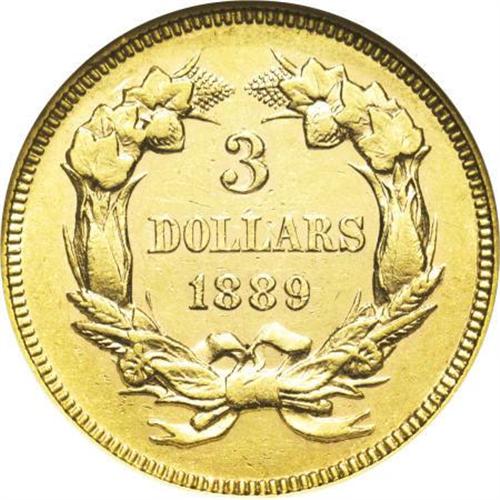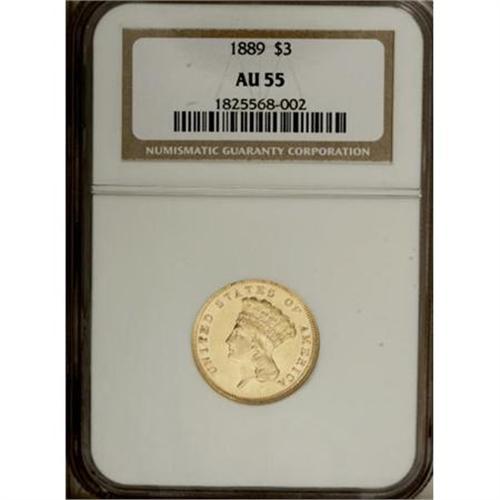 <B>1889 $3 AU55 NGC.</B></I> This Choice AU three dollar exhibits brassy-gold surfaces that have a faint greenish cast, and a solid strike manifests itself in strong definition on the design elements. A few minute marks are scattered about both sides. This is the last year of the three dollar denomination.<BR><BR><B>Coin Engraver:</B> James B. Longacre<BR><BR><b>Shipping:</b> Coins & Currency (<a target="_blank" href="http://www.heritageauctions.com/common/shipping.php">view shipping information</a>)