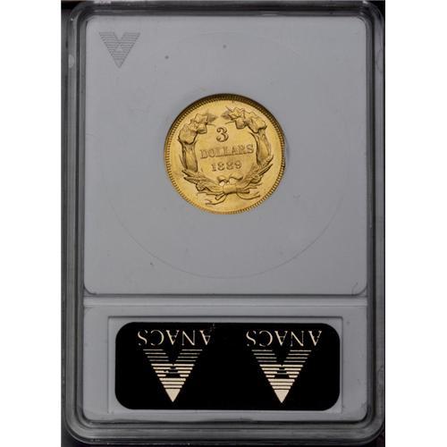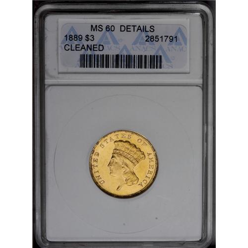 <B>1889<$3>--Cleaned--ANACS. MS60 Details.</B></I> Bright luster dominates legends and devices. Mildly cleaned, but still a presentable example of this challenging final year issue. A mere 2,300 pieces were struck.