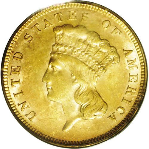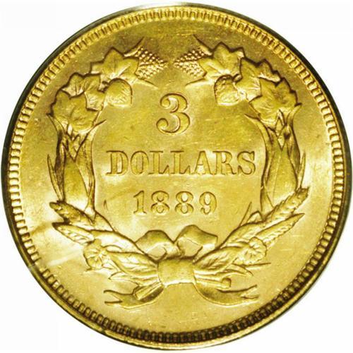 <B>1889<$3> MS61 PCGS.</B></I> This orange-gold representative has ample bright luster and only a hint of softness on the highpoints of the designs. Distributed minor marks are unavoidable for the grade, but the eye appeal is undeniable. Certified in a green label holder. Much scarcer than its final-year gold dollar counterpart; numismatists of the day apparently wanted a more affordable souvenir of the design. Only 2,300 business strikes were coined.