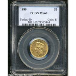 <table><tr><td><TABLE cellSpacing=0 cellPadding=0 width="100%" bgColor=#000000 border=0><TBODY> <TR><TD width="100%"><TABLE cellSpacing=1 cellPadding=3 width="100%" border=0><TBODY><TR><TD width="100%" bgColor=#79735c><FONT face=arial color=#ffffff size=3><B>Description</B> </FONT></TD></TR><TR><TD width="100%" bgColor=#ffffff><FONT face=arial size=2><B>1889 $3 MS62 PCGS.</B></I> Sharply struck with fairly good luster characteristics for the grade. Subtle, reddish-golden patina covers most of the surfaces on this popular issue. Only 2,300 pieces were struck in this final year of the three-dollar coin, but Breen suggests that many were melted in 1890 after the denomination was abolished.<BR><I>From The New Millennium Collection.</B></I> </FONT></TD></TR></TBODY></TABLE></TD></TR></TBODY></TABLE><BR><A name=PricesRealized></A><TABLE cellSpacing=0 cellPadding=0 width="100%" bgColor=#000000 border=0><TBODY><TR><TD width="100%"><TABLE cellSpacing=1 cellPadding=3 width="100%" border=0><TBODY><TR><TD width="100%" bgColor=#79735c><A name=PR><FONT face=arial color=#ffffff size=3><B>Previous Prices from Heritage Auctions</B> </FONT></A></TD></TR><TR><TD bgColor=#f6f6ed><TABLE cellSpacing=0 cellPadding=0 width="100%" border=1><TBODY><TR><TD align=middle width="33%"><B>Date</B></TD><TD align=middle width="33%"><B>Service</B></TD><TD align=middle width="33%"><B>Price</B></TD></TR><TR bgColor=whitesmoke><TD width="33%"><B>06/04/1995</B></TD><TD width="33%">PCGS</TD><TD width="33%">$2,640.00</TD></TR><TR bgColor=whitesmoke><TD width="33%"><B>08/09/2000</B></TD><TD width="33%">PCGS</TD><TD width="33%">$2,875.00</TD></TR><TR bgColor=whitesmoke><TD width="33%"><B>08/01/1999</B></TD><TD width="33%">PCGS</TD><TD width="33%">$2,185.00</TD></TR></TBODY></TABLE></TD></TR><TR><TD bgColor=#ffffff><FONT face=arial size=1 ?>PLEASE NOTE: All prices realized reflect the final hammer price PLUS the buyer's premium in auctions that charge a buyer's premium. Each item has a notation at the top of the listing indicating whether that lot included a buyer's premium. Example: A item that sells with a final hammer price of $100 and a 20% buyer's premium will display with a price realized of $120. All information listed is intended to be as accurate as possible, but errors are possible. Please use this guide carefully and inform us of any inaccuracies. </FONT></TD></TR></TBODY></TABLE></TD></TR></TBODY></TABLE><BR><TABLE cellSpacing=0 cellPadding=0 width="100%" bgColor=#000000 border=0><TBODY><TR><TD width="100%"><TABLE cellSpacing=1 cellPadding=3 width="100%" border=0><TBODY><TR><TD width="100%" bgColor=#79735c colSpan=6><FONT face=arial color=#ffffff size=3><B>Price Guide*</B> </FONT></TD></TR><TR bgColor=#f6f6ed><TD align=middle><B>Grade</B> </TD><TD align=middle><B>Coin World<BR>(Trends)</B> </TD><TD align=middle><B>Numismedia<BR>Retail</B> </TD><TD align=middle><B>Numismedia<BR>Wholesale</B> </TD><TD align=middle><B>Coin<BR>Universe</B> </TD><TD align=middle><B>Heritage<BR>Value Index</B> </TD></TR><TR bgColor=#ffffff><TD align=middle>61</TD><TD align=right>---</TD><TD align=right>---</TD><TD align=right>$2,150.00</TD><TD align=right>$2,200.00</TD><TD align=right>$1,960.33</TD></TR><TR style="FONT-WEIGHT: bold" bgColor=#cccfdd><TD align=middle>62</TD><TD align=right>$3,500.00</TD><TD align=right>---</TD><TD align=right>$2,475.00</TD><TD align=right>$2,850.00</TD><TD align=right>$2,490.67</TD></TR><TR bgColor=#ffffff><TD align=middle>63</TD><TD align=right>$6,000.00</TD><TD align=right>---</TD><TD align=right>$4,350.00</TD><TD align=right>$5,000.00</TD><TD align=right>$3,858.25</TD></TR><TR bgColor=#ffffff><TD colSpan=6><FONT size=1>*All information listed is intended to be as accurate as possible, but errors are possible. No item may be returned or refused based on this information which is provided as a service to our customers. You should contact each pricing source directly to determine the accuracy of this information. </FONT></TD></TR></TBODY></TABLE></TD></TR></TBODY></TABLE><BR><TABLE cellSpacing=0 cellPadding=0 width="100%" bgColor=#000000 border=0><TBODY><TR><TD width="100%"><TABLE cellSpacing=1 cellPadding=3 width="100%" border=0><TBODY><TR><TD width="100%" bgColor=#79735c><FONT face=arial color=#ffffff size=3><B>Population Guide</B> </FONT></TD></TR><TR bgColor=#ffffff><TD align=middle><!-- Begin Output of Population Grid--><TABLE cellSpacing=0 cellPadding=0 width="100%" border=0><TBODY><TR><TD vAlign=center><TABLE cellSpacing=0 width="100%" border=1 cellsadding="3"><TBODY><TR><TD vAlign=center><TABLE cellSpacing=0 cellPadding=3 width="100%" border=1><TBODY><TR><TD vAlign=center align=middle bgColor=#f0f1e8 colSpan=2 <CENTER><FONT face=Arial size=2><B>PCGS Pop </B></FONT><CENTER></CENTER></TD><TD vAlign=center align=middle bgColor=#f0f1e8 colSpan=2><CENTER><FONT face=Arial size=2><B>NGC Pop</B></CENTER></FONT></TD></TR><TR><TD vAlign=center><FONT face=Arial size=2>(62)</FONT> </TD><TD vAlign=center align=right><FONT face=Arial size=2>40</FONT> </TD><TD vAlign=center><FONT face=Arial size=2>(62)</FONT> </TD><TD vAlign=center align=right><FONT face=Arial size=2>32</FONT> </TD></TR><TR><TD vAlign=center><FONT face=Arial size=2>(>62)</FONT> </TD><TD vAlign=center align=right><FONT face=Arial size=2>129</FONT> </TD><TD vAlign=center><FONT face=Arial size=2>(>62)</FONT> </TD><TD vAlign=center align=right><FONT face=Arial size=2>91</FONT> </TD></TR></TBODY></TABLE></TD></TR></TBODY></TABLE></TD></TR></TBODY></TABLE><!-- End Output of Population Grid--></TD></TR></TBODY></TABLE></TD></TR></TBODY></TABLE><BR><TABLE cellSpacing=0 cellPadding=0 width="100%" bgColor=#000000 border=0><TBODY><TR> Important notice: Heritage usually auctions material at the rate of 200-250 lots per hour. On some occasions eBay Live bid software or the Internet may not be able to keep up with the pace of the auction. We recommend placing a realistic absentee bid now as insurance to avoid disappointment. Occasionally the auctioneer may elimina