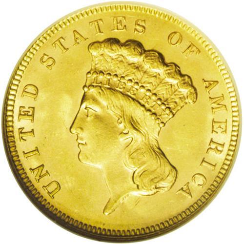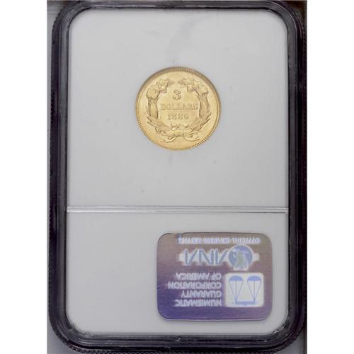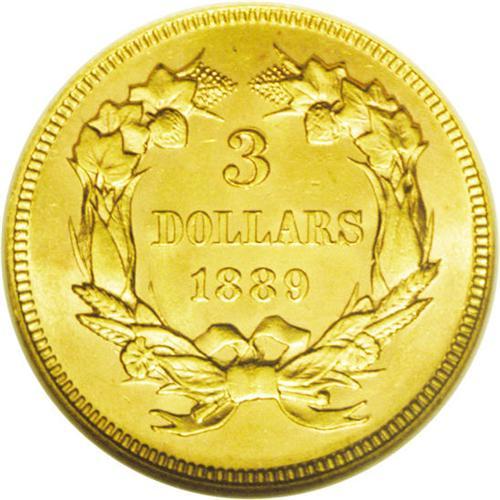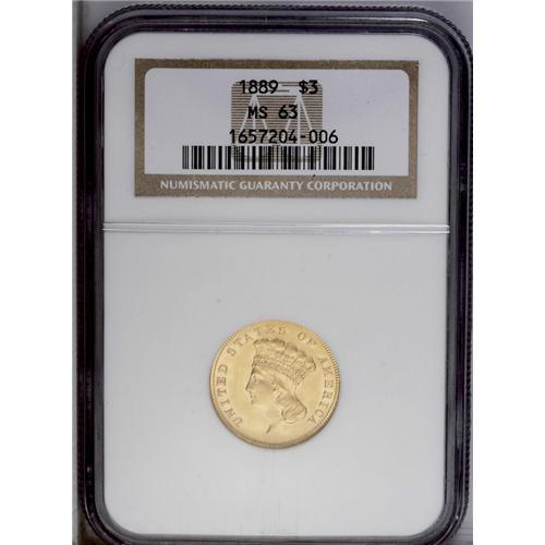 <B>1889<$3> MS63 NGC.</B></I> The 1889 issue is eternally popular as the last year of this beloved and unusual gold series. And fittingly, this last piece is an exemplary combination of technical quality and aesthetic appeal. The frosty surfaces are pristine, with beautiful honey-gold color, a bold strike, and no mentionable distractions. Even under a loupe, only a couple of tiny ticks confirm the grade, and yet this piece appears quite high-end in all regards.<BR><I>From The Derrick Snider Collection.</B></I>