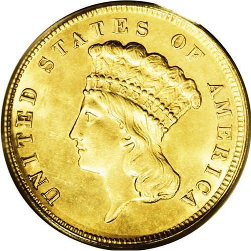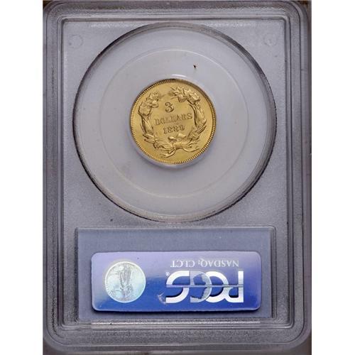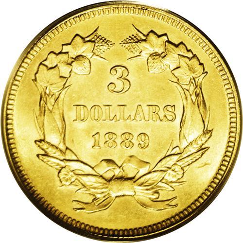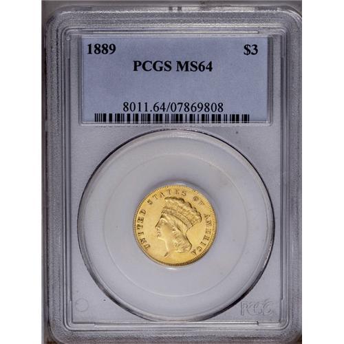 <B>1889<$3> MS64 PCGS.</B></I> During the final year of production for this denomination, the Philadelphia Mint produced 2,300 business strikes and 129 proof examples of this issue. Many of the business strikes were melted the following year, according to Walter Breen, who also noted that Virgil Brand purchased 50 such coins directly from the Mint at an unspecified later date. Today, only a few Choice or Gem Mint State examples remain for collectors to select. Although not a Gem example, this piece should prove to be appreciated by the connoisseur. It is much sharper than usual with full feather details on the obverse and a strong ribbon and bow on the reverse. The surfaces have satiny luster and rich yellow color. Population: 42 in 64, 35 finer (9/06).