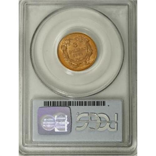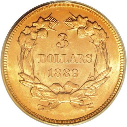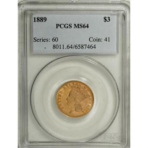 <B>1889 $3 MS64 PCGS.</B></I> In this last year of the three dollar gold denomination, the mintage fell to 2,300 coins. Jeff Garrett and Ron Guth (2006), however, write that: "... a high percentage of the coins survived, mostly in Mint State, reflective of the increase in the number of collectors in America and the demand for the series." Luster dances about the apricot-gold and greenish tinted surfaces of this near-Gem example, and the design elements are strongly impressed. Minute obverse handling marks preclude full Gem classification. Population: 43 in 64, 35 finer (8/07).<BR><BR><B>Coin Engraver:</B> James B. Longacre<BR><BR><b>Shipping:</b> Coins & Currency (<a target="_blank" href="http://www.heritageauctions.com/common/shipping.php">view shipping information</a>)