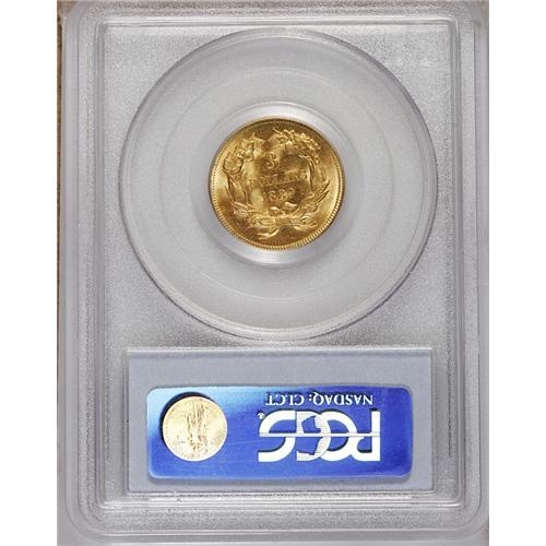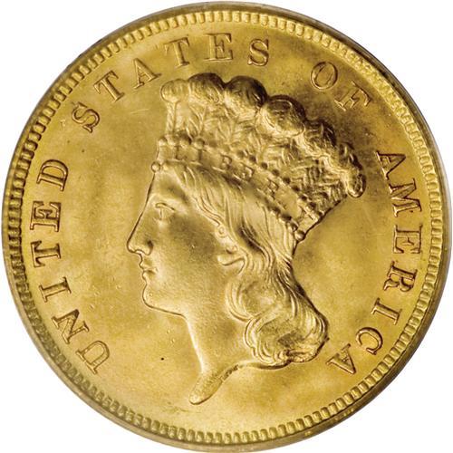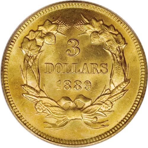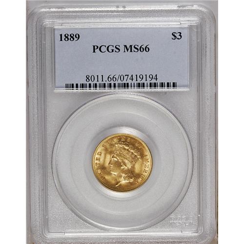 <B>1889 $3 MS66 PCGS.</B></I> Long before the denomination was discontinued in 1889, the writing was on the wall for the three dollar gold piece. Not since 1878 had the mintage exceeded 6,000 pieces and token productions of 500 to 1,500 business strikes during this period was more the norm than the exception.<BR> A mere 2,300 pieces were issued in this final year, few of which actually entered circulation. Several hundred Uncirculated survivors are available to today's collector thanks to hoarding at the time of issue, but the clear majority of these fail to surpass the MS63 grade level. Only an elite few boast the preservation of a Premium Gem. As with most other Mint State survivors, the surfaces on this outstanding representative display abundant radiance and mint frost without a trace of prooflike qualities. The strike is needle sharp in all areas and a pleasing reddish patina accents each side. Only the most insignificant luster grazes can be detected in the fields when examined under magnification. It has been more than a year since we have been able to offer an 1889 three dollar of this caliber. Population: 9 in 66, 2 finer (4/07).<BR><BR><b>Shipping:</b> Coins & Currency (<a target="_blank" href="http://www.heritageauctions.com/common/shipping.php">view shipping information</a>)