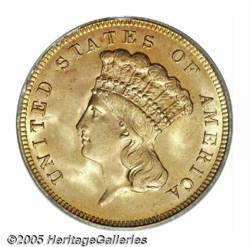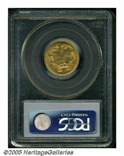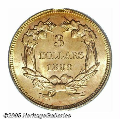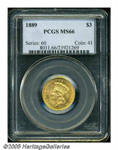 <B>1889<$3> MS66 PCGS.</B></I> This is a remarkable example of the final Three-Dollar gold coin, and is exceeded in quality by only two other coins examined by PCGS. Although a large number of these coins were originally saved from the business strike mintage of just 2,300 coins, few remain as nice as this. This is a gorgeous example with rich honey-gold color and frosty luster. Slightly lighter yellow-gold is limited to the borders, and provides excellent eye appeal. Close examination reveals numerous tiny copper toning spots as almost always seen. Population: 8 in 66, 2 finer (5/05).