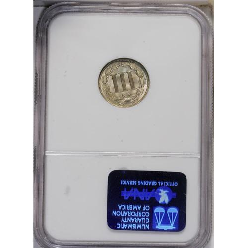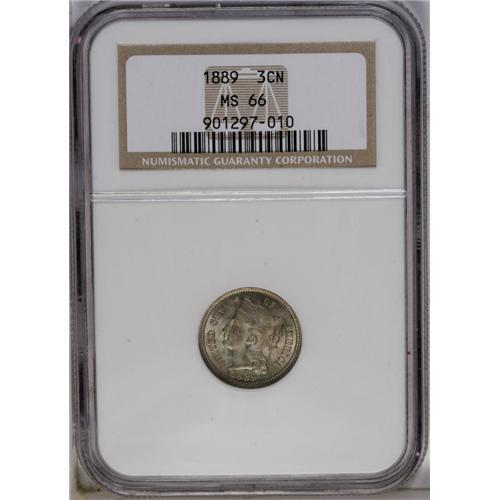 <B>1889<3CN> MS66 NGC.</B></I> This last-of-type Premium Gem has toned attractively in various shades of brown. The well struck devices and fields have no marks worth mentioning.<BR><I>From The Chief Paduke Collection.</B></I>
