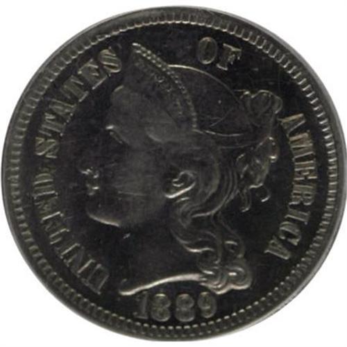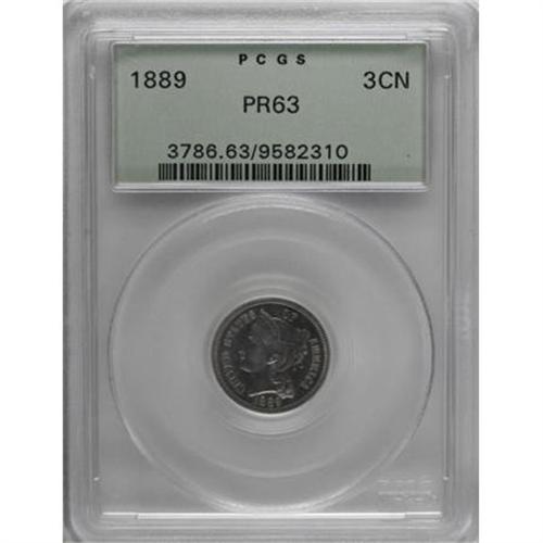 <B>1889 3CN PR63 PCGS.</B></I> PCGS Population (79/964). NGC Census: (27/813). Mintage: 3,436. Numismedia Wsl. Price for NGC/PCGS coin in PR63: $250. (#3786)<BR><BR><B>Coin Engraver:</B> James B. Longacre<BR><BR><b>Shipping:</b> Coins & Currency (<a target="_blank" href="http://www.heritageauctions.com/common/shipping.php">view shipping information</a>)
