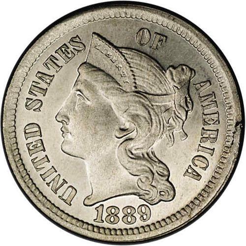 <B>1889<3CN> PR64 NGC.</B></I> Pale golden-gray toning ornaments the centers; the peripheries are brilliant. Striking softness is noted at the obverse rim between 10 o'clock and 1 o'clock, but most other design features are sharp. Excellent eye appeal for the grade. Envelope Included.
