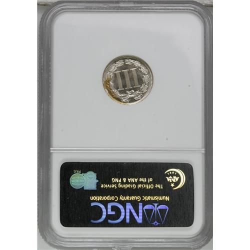 <B>1889 3CN PR65 Cameo NGC.</B></I> Peach toning enriches the left borders of this otherwise brilliant Gem. Well struck and satiny. Only a small portion of 1889 proofs exhibit significant cameo contrast. Census: 8 in 65 Cameo, 19 finer (2/07).<BR><BR><b>Shipping:</b> Coins & Currency (<a target="_blank" href="http://www.heritageauctions.com/common/shipping.php">view shipping information</a>)