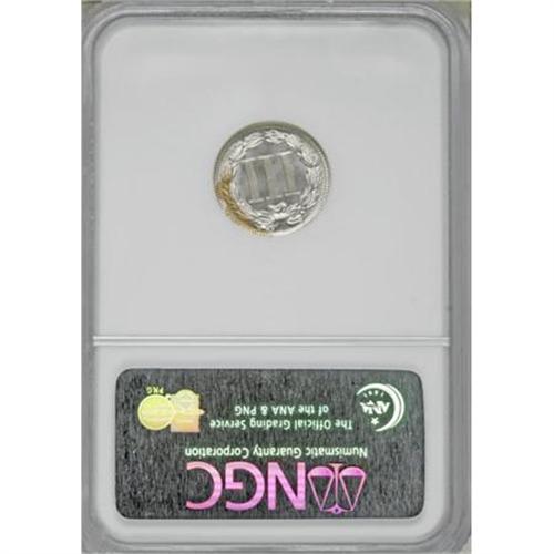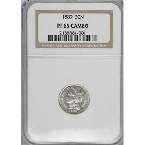 <B>1889 3CN PR65 Cameo NGC.</B></I> Peach toning enriches the left borders of this otherwise brilliant Cameo Gem. Well struck and satiny. Only a small fraction of 1889 proofs exhibit significant contrast. Census: 8 in 65 Cameo, 22 finer (10/07).<BR><BR><b>Shipping:</b> Coins & Currency (<a target="_blank" href="http://www.heritageauctions.com/common/shipping.php">view shipping information</a>)