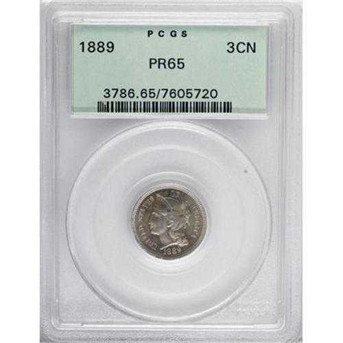 <B>1889 3CN PR65 PCGS.</B></I> PCGS Population (370/294). NGC Census: (356/245). Mintage: 3,436. Numismedia Wsl. Price for NGC/PCGS coin in PR65: $525. (#3786)<BR><BR><b>Shipping:</b> Coins & Currency (<a target="_blank" href="http://www.heritageauctions.com/common/shipping.php">view shipping information</a>)