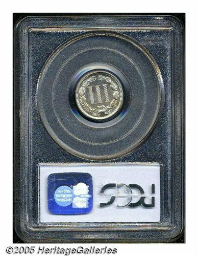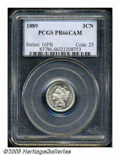 <B>1889<3CN> PR66 Cameo PCGS.</B></I> Scarce with cameo contrast, this proof three cent piece shows moderately frosted devices and mark-free surfaces. As far as color goes, the surfaces are mostly brilliant, with faint apricot toning on the lower reverse. Population: 24 in 66 Cameo, 14 finer (6/05).