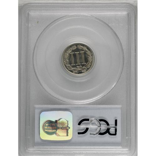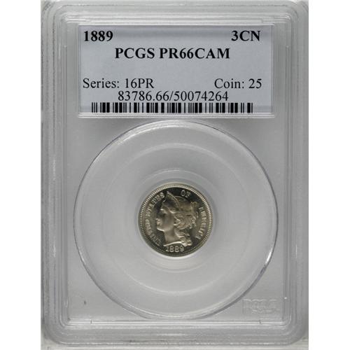 <B>1889<3CN> PR66 Cameo PCGS.</B></I> This is a wonderful Premium Gem with satiny gray surfaces beneath light champagne toning. Although the fields are not deeply mirrored as on many earlier proof examples, there remains enough contrast to be described as a Cameo proof. The obverse has a minor spot atop the head.