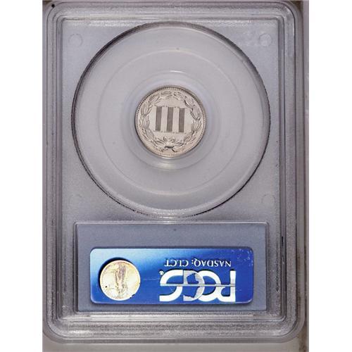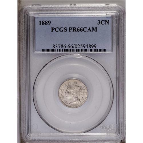 <B>1889<3CN> PR66 Cameo PCGS.</B></I> A flashy final-year specimen with its Cameo designation primarily derived from appreciable contrast on the obverse. Spot-free with hints of lilac and golden color. Population: 26 in 66, 15 finer (3/06). <BR><BR><B>Important notice:</B> Heritage usually auctions material at the rate of 200-250 lots per hour. On some occasions eBay Live bid software or the Internet may not be able to keep up with the pace of the auction. We recommend placing a realistic absentee bid now as insurance to avoid disappointment. Occasionally the auctioneer may eliminate or reject an eBay Live bid, and the auctioneer may also reopen a lot after the close of the eBay live bidding (usually because we missed an audience bid), and may reject your bid even if it shows you as the winning bidder. By bidding via eBay Live, you agree that Heritage may award the lot to another bidder at its sole discretion under the circumstances described above or any other reasonable circumstances. Since eBay bids are not shown to us until we open the lot on the floor, we treat those bids just like floor bids. In most cases the floor responds before the eBay bid is presented to us, due to Internet lag time, so for consistency we have made it a policy that floor bids are always considered first over tie eBay live bids. Also please note that all Heritage lots purchased through eBay Live carry a 20% Buyer's Premium. Please make sure you read the Terms and Conditions before you bid. This lot is being auctioned in conjunction with a live floor auction by Heritage Galleries & Auctioneers. All final auction and invoice information will be supplied by Heritage Galleries & Auctioneers, and all other information should be considered preliminary. Lot:840 <BR><BR><B>Winning Notification and Billing:</B> After the FINAL session in this auction is complete, Heritage will send e-mail and snail mail invoices. This process normally takes several days. All final auction and invoice information will be supplied by Heritage Galleries & Auctioneers, and all other information should be considered preliminary. <BR><BR>This auction will be conducted on a live auction floor and over the Internet through eBay Live. If you choose to place an absentee bid, please take a moment to <font color='#0000ff'><u><a href='http://pages.ebay.com/liveauctions/help/before/laabsentee.html'>learn how eBay Live absentee bidding works</a></u></font><font color='#000000'>