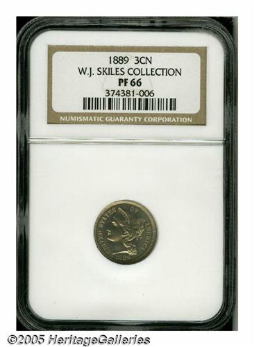 <B>1889<3CN> PR66 NGC.</B></I> Ex: W.J. Skiles Collection. From the final year of issue, this attractively specimen exhibits nicely mirrored fields and nearly flawless quality. Lightly and evenly toned with streaks of tan color.