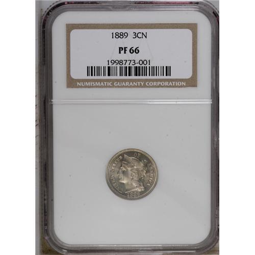 <B>1889<3CN> PR66 NGC.</B></I> Hints of lavender and gold add color to the mildly reflective surfaces of this Premium Gem. The crisply defined devices reaffirm the status of this specimen.