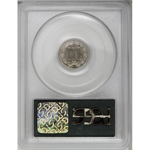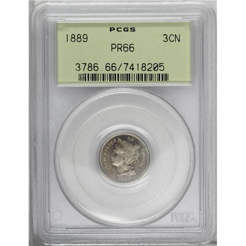 <B>1889<3CN> PR66 PCGS.</B></I> A meticulously struck final-year Premium Gem with smooth, original tan-gray surfaces. The 1 in the date is repunched on the flag and base. Housed in an old green label holder. <BR><BR><B>Important notice:</B> Heritage usually auctions material at the rate of 200-250 lots per hour. On some occasions eBay Live bid software or the Internet may not be able to keep up with the pace of the auction. We recommend placing a realistic absentee bid now as insurance to avoid disappointment. Occasionally the auctioneer may eliminate or reject an eBay Live bid, and the auctioneer may also reopen a lot after the close of the eBay live bidding (usually because we missed an audience bid), and may reject your bid even if it shows you as the winning bidder. By bidding via eBay Live, you agree that Heritage may award the lot to another bidder at its sole discretion under the circumstances described above or any other reasonable circumstances. Since eBay bids are not shown to us until we open the lot on the floor, we treat those bids just like floor bids. In most cases the floor responds before the eBay bid is presented to us, due to Internet lag time, so for consistency we have made it a policy that floor bids are always considered first over tie eBay live bids. Also please note that all Heritage lots purchased through eBay Live carry a 20% Buyer's Premium. Please make sure you read the Terms and Conditions before you bid. This lot is being auctioned in conjunction with a live floor auction by Heritage Galleries & Auctioneers. All final auction and invoice information will be supplied by Heritage Galleries & Auctioneers, and all other information should be considered preliminary. Lot:839 <BR><BR><B>Winning Notification and Billing:</B> After the FINAL session in this auction is complete, Heritage will send e-mail and snail mail invoices. This process normally takes several days. All final auction and invoice information will be supplied by Heritage Galleries & Auctioneers, and all other information should be considered preliminary. <BR><BR>This auction will be conducted on a live auction floor and over the Internet through eBay Live. If you choose to place an absentee bid, please take a moment to <font color='#0000ff'><u><a href='http://pages.ebay.com/liveauctions/help/before/laabsentee.html'>learn how eBay Live absentee bidding works</a></u></font><font color='#000000'>