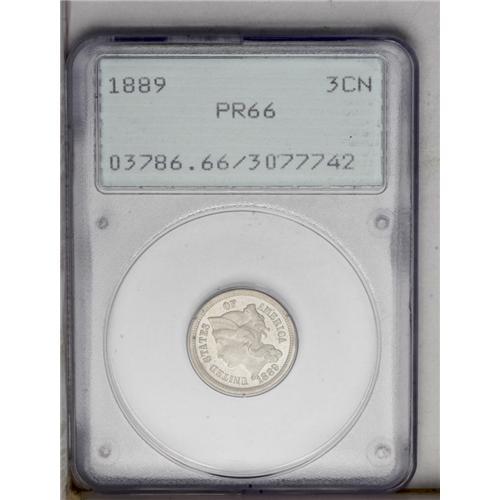 <B>1889<3CN> PR66 PCGS.</B></I> Luminous gray surfaces display sharply impressed design elements, including full definition in the lines of the III. A couple of tiny light flecks are noted on the obverse. Housed in a first generation PCGS holder.