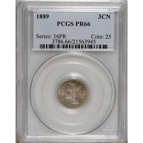 <B>1889 3CN PR66 PCGS.</B></I> RPD-001. The date is repunched below the base of the 1. Only moderately reflective, the surfaces are nevertheless swirling with mint luster that enhance the pale rose toning seen over each side.<BR><BR><b>Shipping:</b> Coins & Currency (<a target="_blank" href="http://www.heritageauctions.com/common/shipping.php">view shipping information</a>)