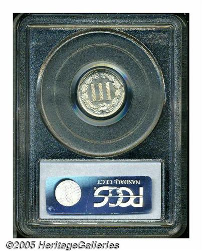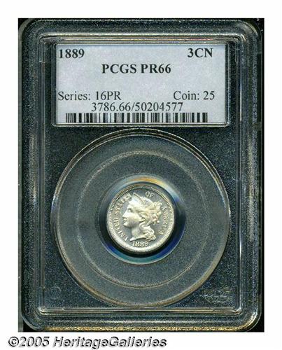 <B>1889<3CN> PR66 PCGS.</B></I> This is a remarkable Gem Proof with exceptional eye appeal. The fields are deeply reflective and fully brilliant with faint wisps of champagne toning on both sides. Although not designated as a cameo example, both sides have remarkable contrast.