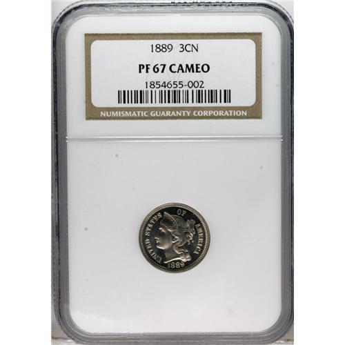 <B>1889 3CN PR67 Cameo NGC.</B></I> This flashy Superb Gem has pleasing contrast between the luminous devices and the mirrored fields. Gently toned and unabraded with only a solitary, small spot at 1:30. Census: 5 in 67 Cameo, 0 finer (2/07).<BR><BR><b>Shipping:</b> Coins & Currency (<a target="_blank" href="http://www.heritageauctions.com/common/shipping.php">view shipping information</a>)
