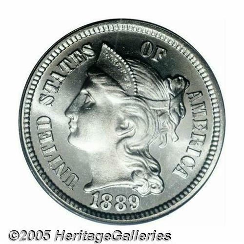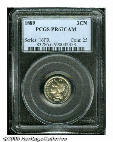 <B>1889<3CN> PR67 Cameo PCGS.</B></I> A nearly flawless final year representative that is essentially untoned and possesses extraordinary vibrancy, even for a proof. Hints of golden and lilac patina highlights the flashier obverse. Population: 13 in 67 Cameo, 0 finer (5/05).<BR><I>From The Western Hills Collection.</B></I>