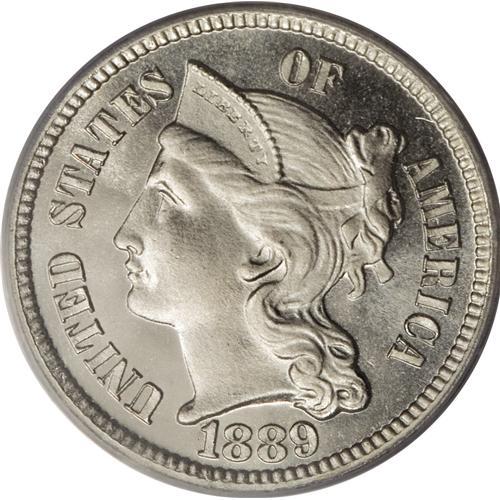 <B>1889 3CN PR67 Cameo PCGS.</B></I> The 1889 final-year-of-issue three cent nickel displays a relatively large proof mintage of 3,436 pieces. As might be expected, a large number have been certified by PCGS and NGC (approximately 1,700 specimens). About 120 coins rate the Cameo designation. Immaculately preserved, untoned Cameoed surfaces greet the observer of the wonderful Superb Gem presented for sale in this lot. Powerfully impressed design elements round out the coin's splendid eye appeal. Population: 17 in 67, 1 finer (3/07).<BR><BR><b>Shipping:</b> Coins & Currency (<a target="_blank" href="http://www.heritageauctions.com/common/shipping.php">view shipping information</a>)