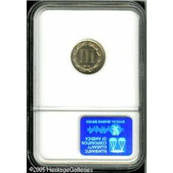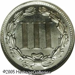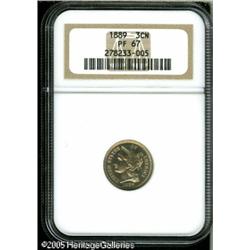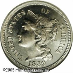 <B>1889 3CN PR67 NGC.</B></I> A dazzling piece that retains nearly full mint luster and some reflectivity in the fields. The strike is rich and sharp and the surfaces are close to perfection in their absence of marks. A beautiful coin in every aspect with a mintage of just 3,436 proofs. This extraordinary coin boasts a very small certified population of just 40 pieces by NGC, and 45 at PCGS with one finer at each service (1/05). Lot:5834