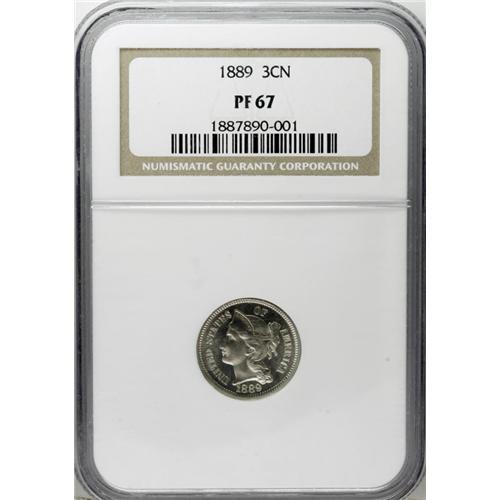 <B>1889 3CN PR67 NGC.</B></I> Modestly reflective with traces of cream-colored patina over parts of the obverse. Attractive and unusually well-preserved with pleasing detail. Census: 39 in 67, 1 finer (11/06).<BR><BR><b>Shipping:</b> Coin/Currency (<a target="_blank" href="http://www.heritageauctions.com/common/shipping.php">view shipping information</a>)