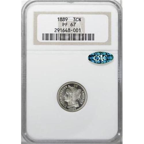 <B>1889 3CN PR67 NGC. CAC.</B></I> Barely discernible light toning on the reverse cedes to a color-free obverse. Immaculately preserved surfaces yield attentively struck design elements. Census: 40 in 67, 1 finer (1/08).<BR><I>From The Southwest Collection.</B></I><BR><BR><B>Coin Engraver:</B> James B. Longacre<BR><BR><b>Shipping:</b> Coins & Currency (<a target="_blank" href="http://www.heritageauctions.com/common/shipping.php">view shipping information</a>)