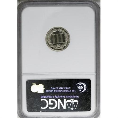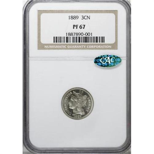<B>1889 3CN PR67 NGC. CAC.</B></I> Modestly reflective with traces of cream patina over parts of the obverse. Attractive and unusually well-preserved with pleasing detail, a great specimen from the final year of three cent nickel production. NGC has graded just one finer example (1/08).<BR><BR><B>Coin Engraver:</B> James B. Longacre<BR><BR><b>Shipping:</b> Coins & Currency (<a target="_blank" href="http://www.heritageauctions.com/common/shipping.php">view shipping information</a>)