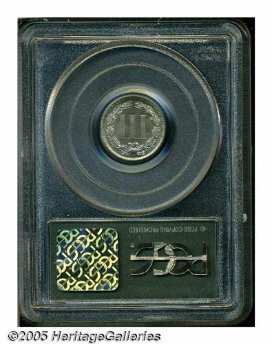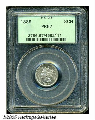 <B>1889<3CN> PR67 PCGS.</B></I> A satiny, lustrous appearance accents the modestly mirrored fields. As expected for a proof, the strike is sharp and precise. Near-perfect overall quality for this final year issue. Population: 45 in 67, 1 finer (6/05).
