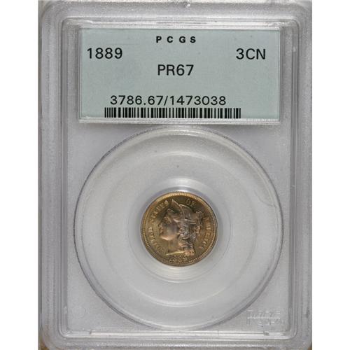 1889 3CN PR67 PCGS. Even golden toning covers each sid