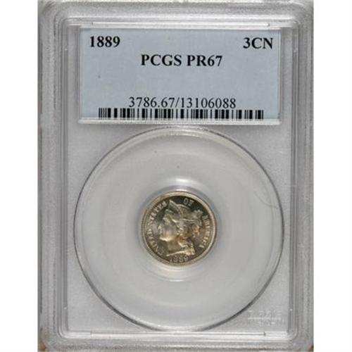 <B>1889 3CN PR67 PCGS.</B></I> Blushes of tan-gold toning adorn the centers of this final-year Superb Gem. The strike is intricate except for the denticles. Only microscopic carbon denies perfection. Population: 49 in 67, 1 finer (4/07).<BR><BR><b>Shipping:</b> Coins & Currency (<a target="_blank" href="http://www.heritageauctions.com/common/shipping.php">view shipping information</a>)