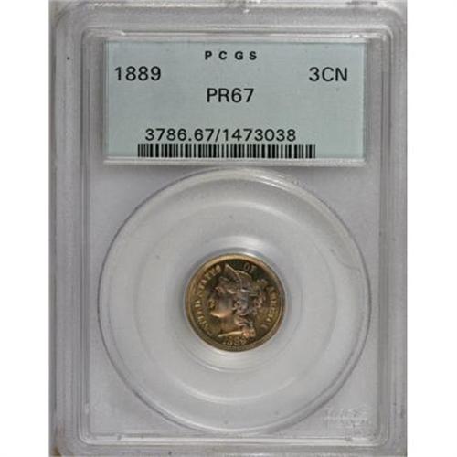 <B>1889 3CN PR67 PCGS.</B></I> Even golden toning graces both sides of this intricately detailed and shining Superb Gem, an excellent specimen from the final year of the denomination. PCGS has graded just one finer piece (8/07).<BR><BR><B>Coin Engraver:</B> James B. Longacre<BR><BR><b>Shipping:</b> Coins & Currency (<a target="_blank" href="http://www.heritageauctions.com/common/shipping.php">view shipping information</a>)