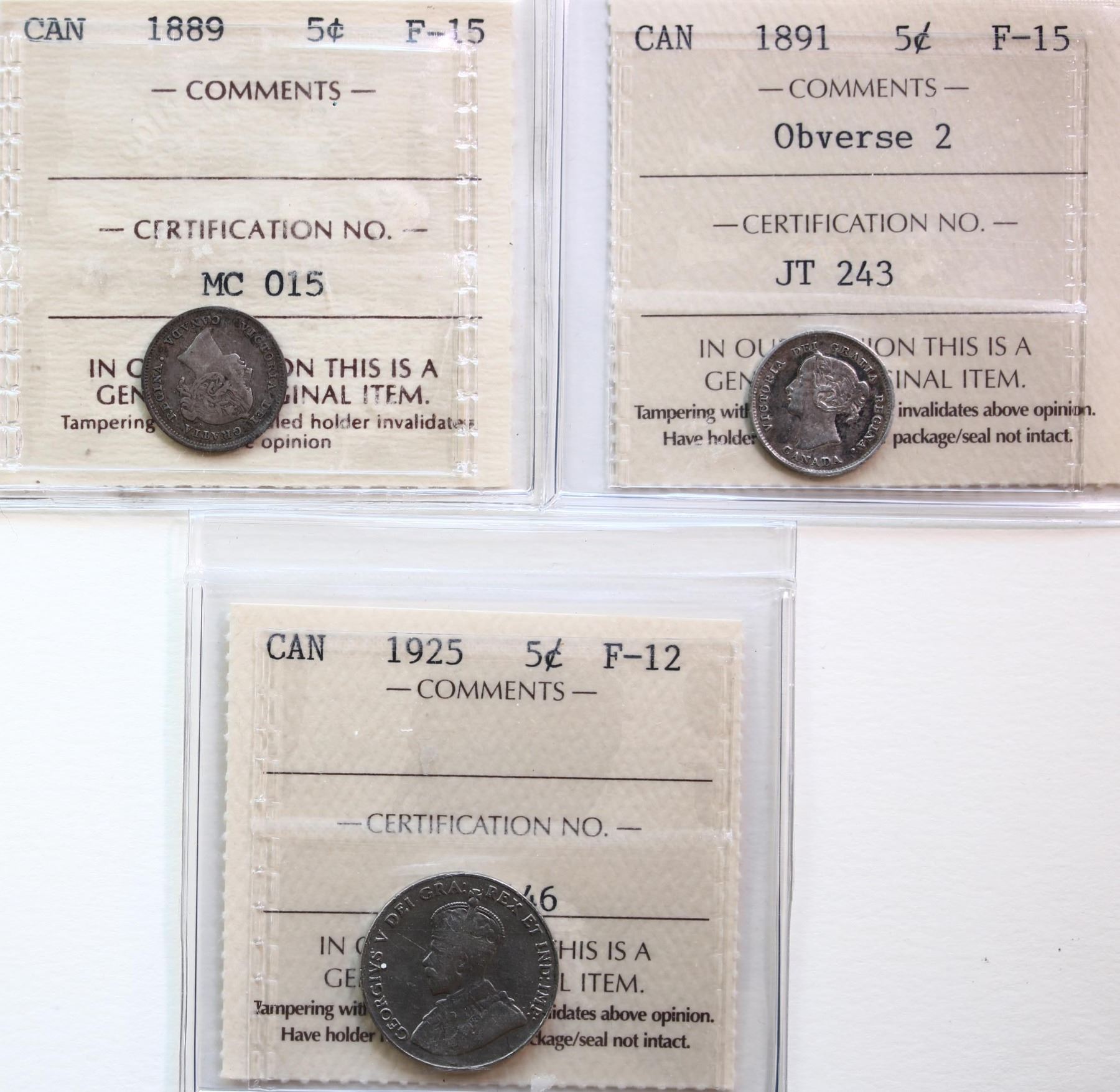 1889 5¢, 1891 "Obv2", 1925. Lot of 3 coins ICCS Fine-12 toChoice Fine-15