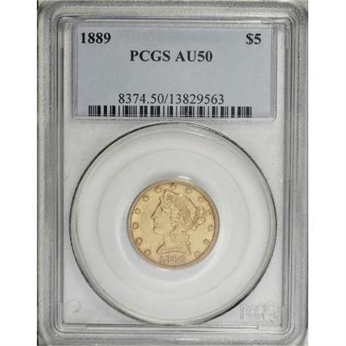 <B>1889 $5 AU50 PCGS.</B></I> PCGS Population (16/103). NGC Census: (6/119). Mintage: 7,565. Numismedia Wsl. Price for NGC/PCGS coin in AU50: $425. (#8374)<BR><BR><B>Coin Engraver:</B> Christian Gobrecht<BR><BR><b>Shipping:</b> Coins & Currency (<a target="_blank" href="http://www.heritageauctions.com/common/shipping.php">view shipping information</a>\)