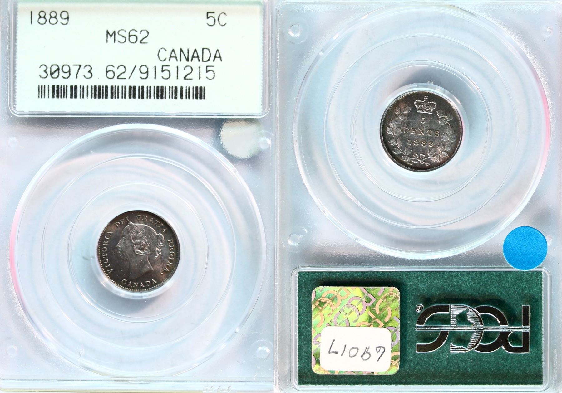 1889 5¢ PCGS Choice Mint State-62 Lithly toned example - Semi Key date.