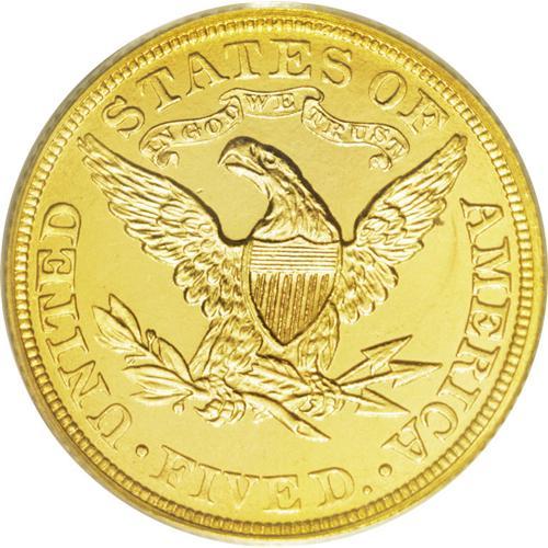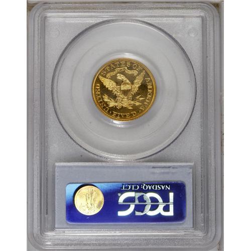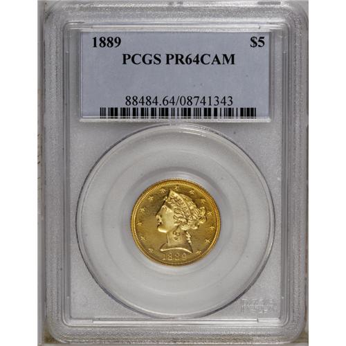 <B>1889<$5> PR64 Cameo PCGS.</B></I> This is a sharply struck and deeply mirrored Cameo proof that just misses Gem quality due to a few faint hairlines visible in the fields, most noticeably below AMER on the reverse. Both sides have a combination of lovely lemon-yellow and honey-gold colors with lighter yellow-gold on the devices. Current estimates suggest that a little less than half of the original 45 coin mintage still survive, or about 15 to 20 coins. Two of these reside in the Smithsonian Institution. Meanwhile, PCGS has only certified seven proof examples of this date, and the present piece is tied with one other for the finest of those seven coins (9/06).
